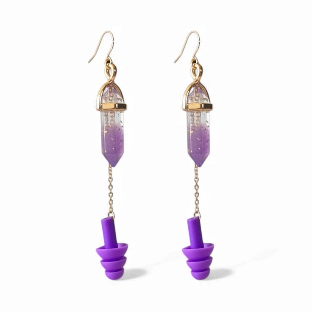 The Purple Crystal Earplug Earrings are perfect for ravers, concert-goers, and those who need hearing protection without compromising on style. Whether you're attending loud music festivals, car races, or frequenting the shooting range, these sensory friendly earplug earrings ensure you’re always prepared for overstimulation or harmful noise.
